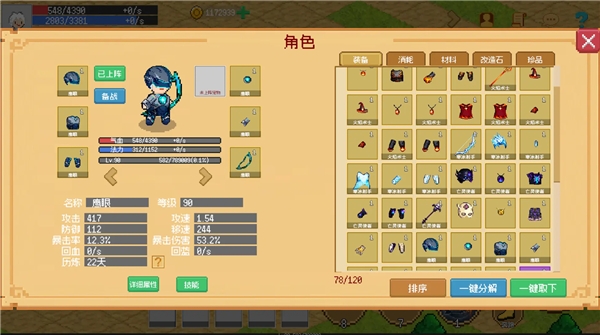 2、点击右上角的角色可以查看自己的属性、职业以及拥有的装备。