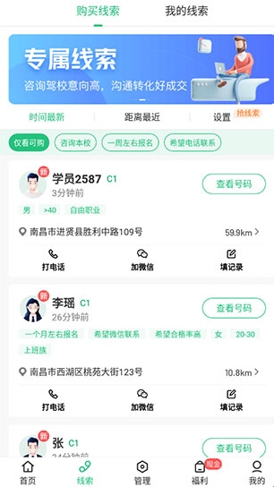 2、在线索页面,可以查看最新学员的报名线索;
