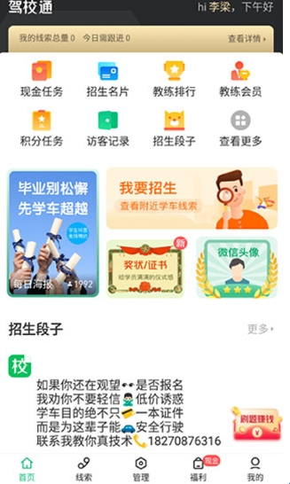 2、招生名片:属于自己移动招生名片,建立自己的驾校品牌;