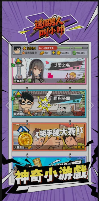 在《这个男人叫小帅》中,你将踏上一段充满挑战与乐趣的旅程,帮助主角小帅从一个欠债的鲁蛇,成长为一个拥有全宇宙产业的商业传奇。游戏以轻松诙谐的风格以及丰富多彩的玩法,带给玩家独特的经营体验。