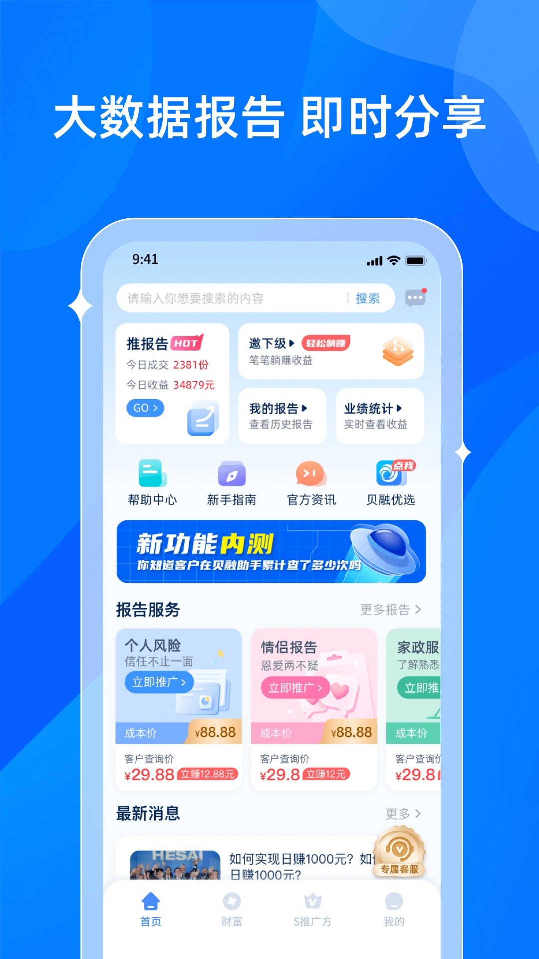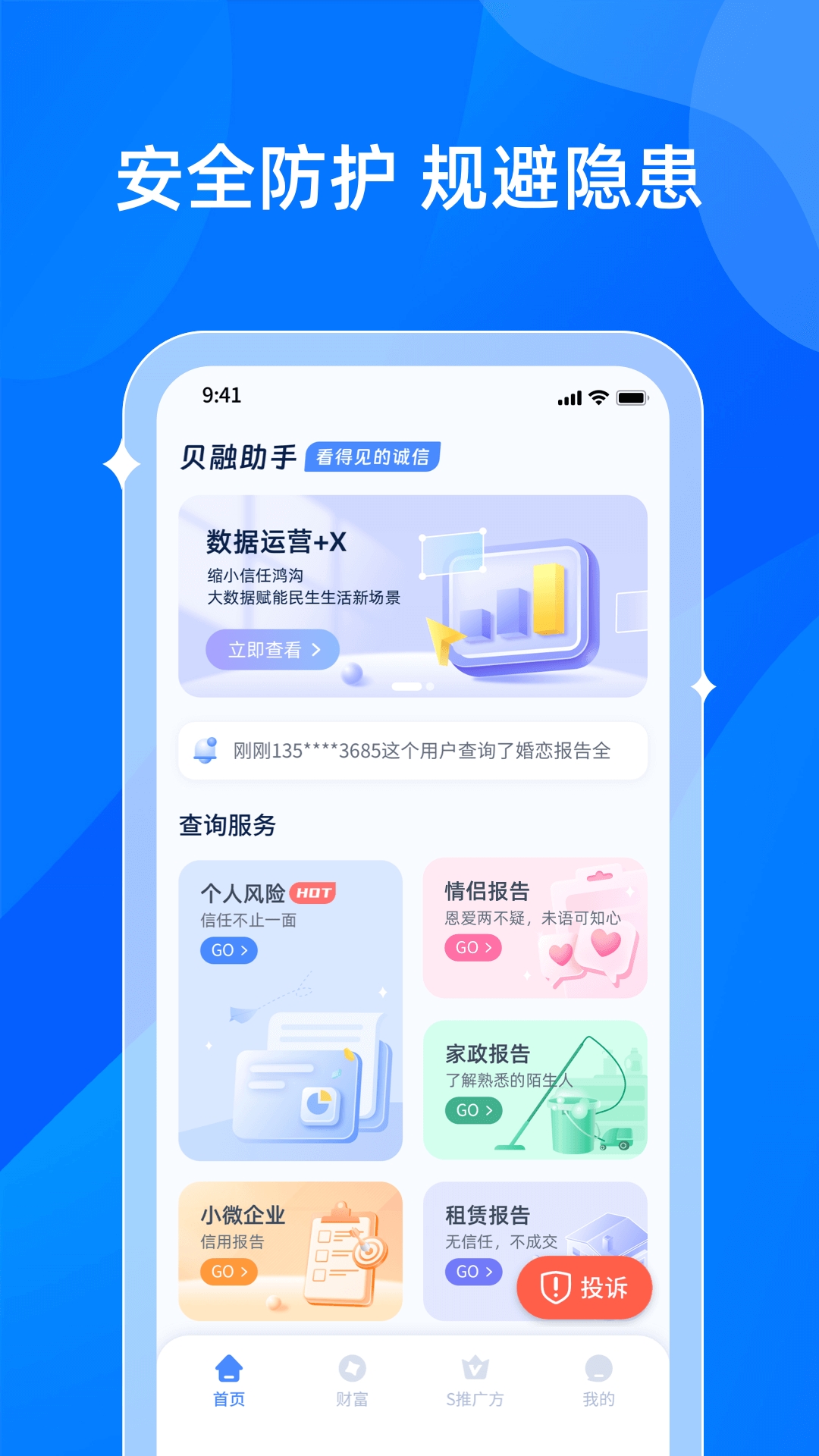 贝融助手,是一款非常实用的大数据安全评估工具,软件内置多种功能,涵盖查询报告、官方咨询、个人风险、情侣报告等,用户可以根据自己的需求进行点击。软件提供深度场景分析融合,可以给出多种分析报告,依靠技术全息、真实、准确的分析,满足各行各业的需求服务。