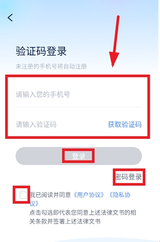 2、跳转至登录界面后,输入手机号,验证码,我已阅读并同意 《用户协议》 《隐私协议》,点击勾选即代表您同意上述法律文书的相关条款并签署上述法律文书后,点击登录即可,还可以点击密码登录,输入手机号,密码进行登录