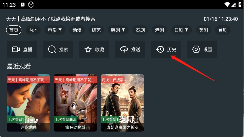 1、进入到app首页,点击历史。