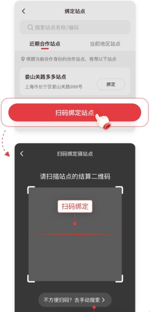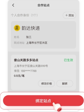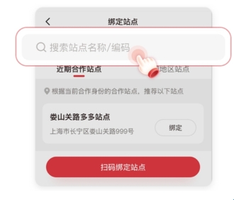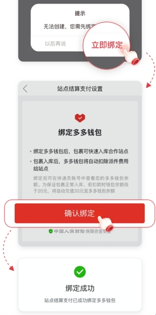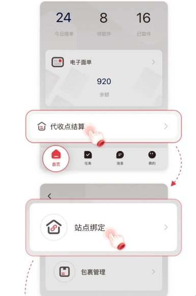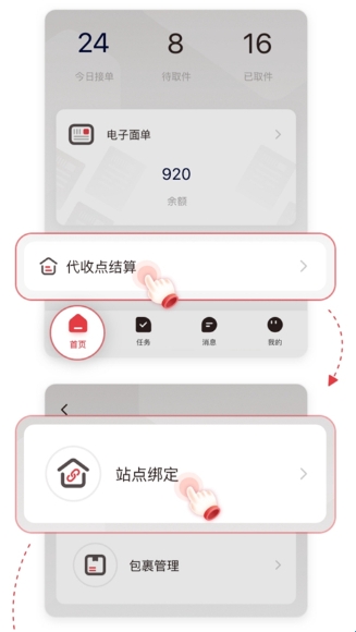 1、打开拼多多快递员版app并登录,先完成多多钱包的绑定,在首页点击【代收点结算】(首次使用需要完成实名认证),选择【站点绑定】。