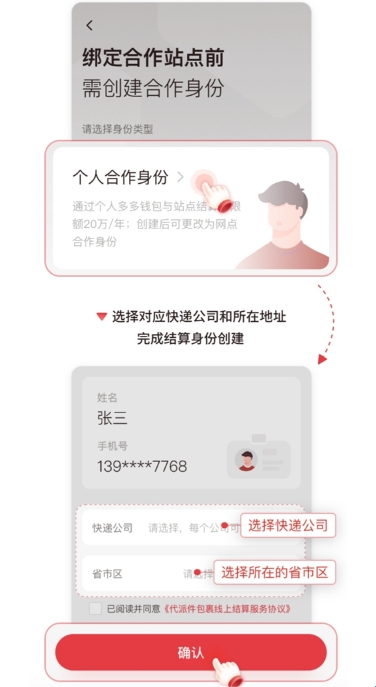 4、点击【个人合作身份】,选择对应快递公司和所在地址,点击【确认】完成结算身份创建。
