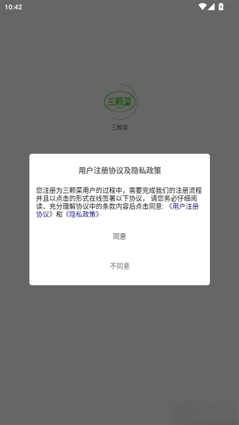 1、下载三颗菜app安装好,第一次打开看到如下弹窗直接点同意。