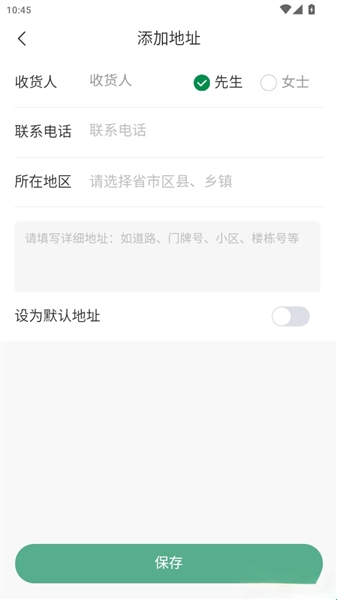 5.输入收货人姓名、选择性别、输入联系电话、所在地区信息点击“保存”即可。