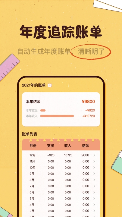 2、年度追踪账单:自动生成年度账单,清晰明了。