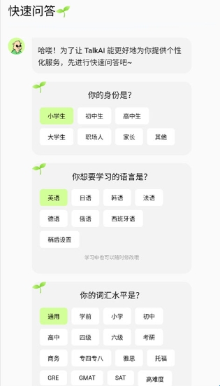 1、首先进入TalkAI练口语官方版,选择自己的身份信息以及词汇水平;