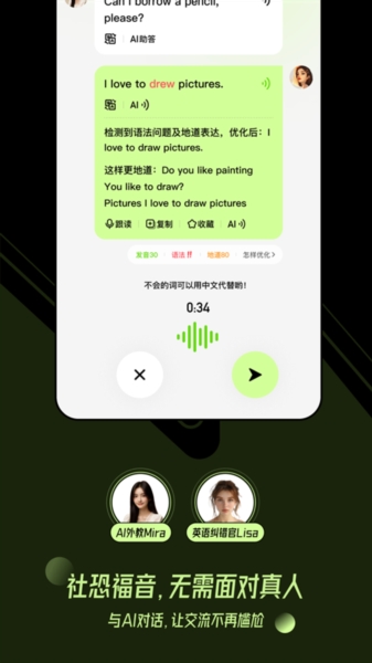 2、无惧犯错:AI智能纠错,帮助用户及时发现并改正语法错误,增强口语自信。