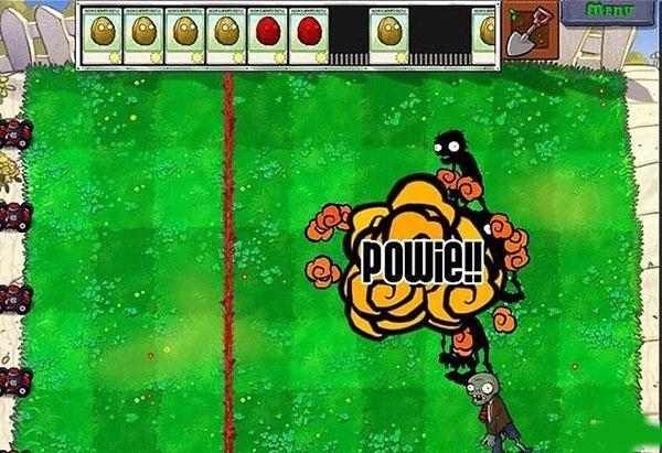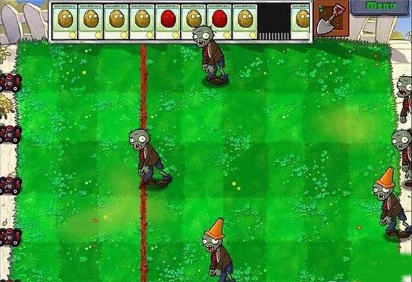 2、让僵尸先过来,上面的墙果快攒满的时候,或者僵尸到红线跟前了,扔吧。红的不要乱扔,那可以炸一片,而且是秒杀效果。