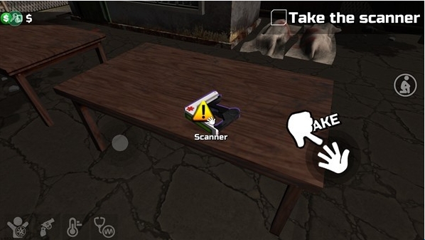 2、完成视角移动和人物移动教程后,找到桌上的检测仪,点击右侧按钮拾取;