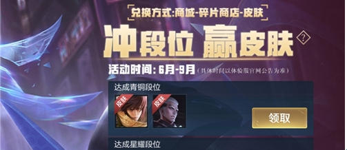 看到这个6月-9月的冲段位活动没有,仅需达到青铜段位就能免费领取澜和司空震这两名英雄的伴生皮肤。