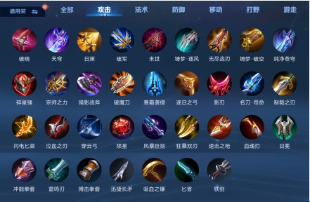 有攻速武器、物理伤害武器、暴击伤害武器、物理吸血武器和破甲穿透武器等。攻击武器适合射手、战士、刺客等英雄。