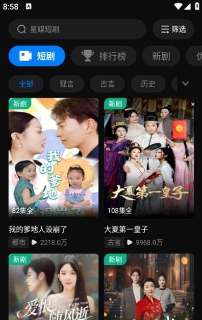 星媒短剧app是一款非常好用的短剧播放软件,这款软件内拥有海量的短剧资源,总裁豪门、重生复仇、纯爱甜宠、恐怖灵异等各种风格类型的短剧在这里都可以找到,满足用户多样化的短剧观看需求。软件内的资源更新十分及时,确保用户可以第一时间观看最新的剧情内容,喜欢看短剧的朋友们快来下载吧。
