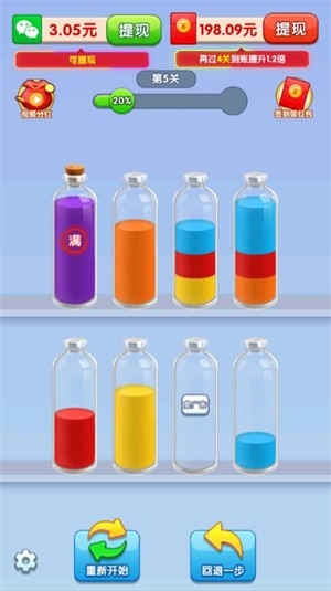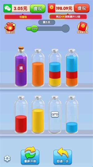 3.所有瓶子中的液体都是一种颜色的时候则通关。