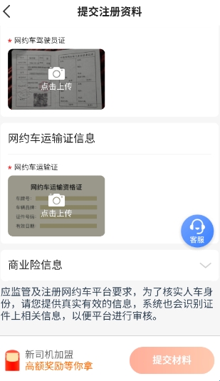 4、填写网约车驾驶员证、运输证等必要资质,并提交平台审核。