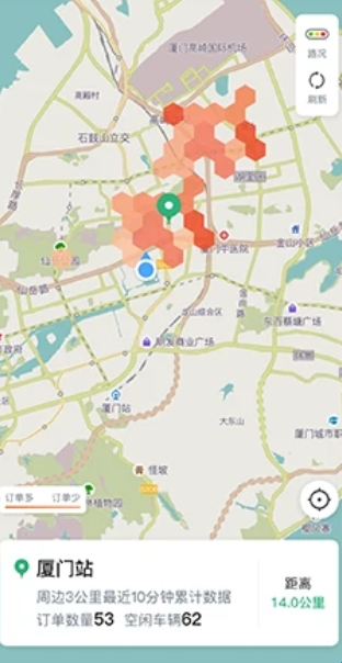 2、智能热力图实时展示订单最多地点,找到优质接单点;