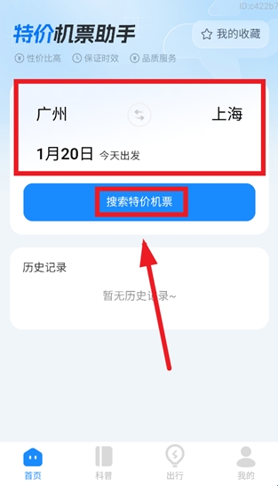 1、打开特价机票助手app,进入首页后,选择出发地,目的地,时间,点击搜索特价机票;