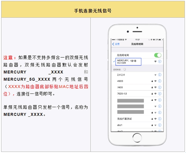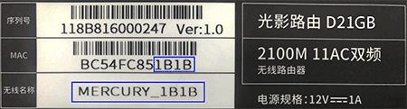 本文以支持多频合一的双频路由器为例,在路由器的底部标贴上查看路由器出厂的无线信号名称,一般是MERCURY_XXXX(XXXX为路由器底部标贴MAC地址后四位),如下图: