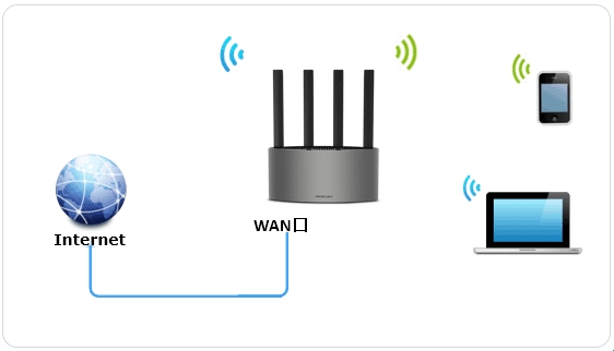 将前端上网的宽带线连接到路由器的WAN口,手机搜索连接路由器的无线信号。