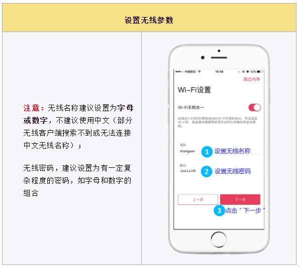 下一步进入无线参数设置页面,设置无线名称以及无线密码,点击“下一步”。如下图: