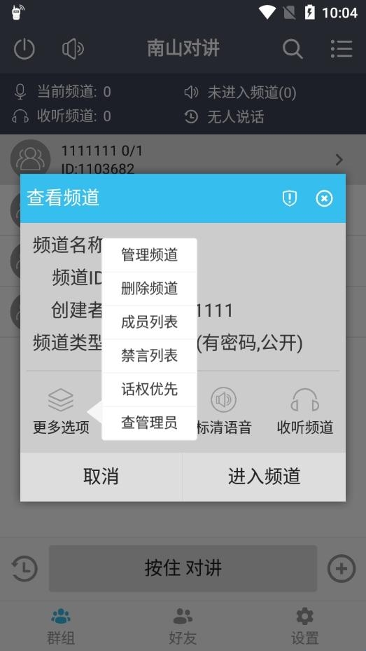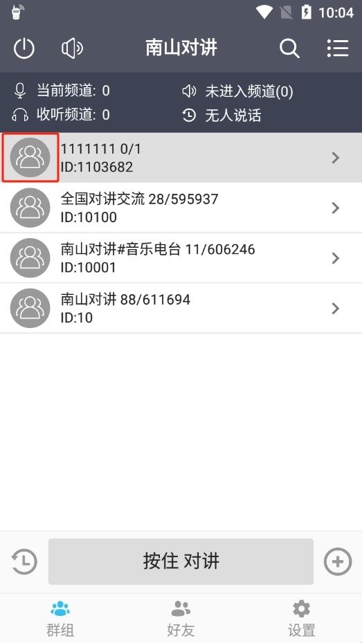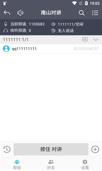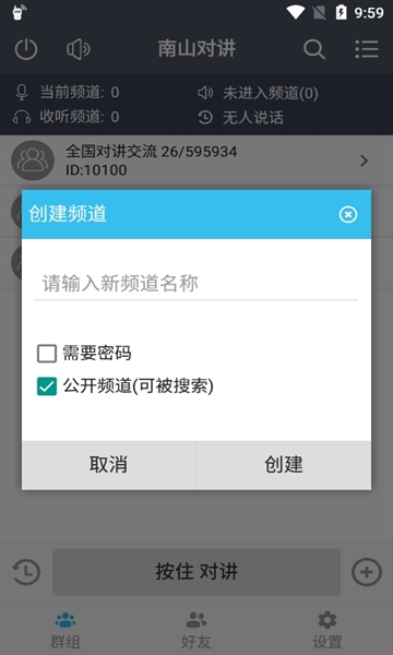 3、创建好之后,别人就可以点击旁边的放大镜进行搜索,然后进入频道,点击下方的【按住对讲】就可以开始交流;