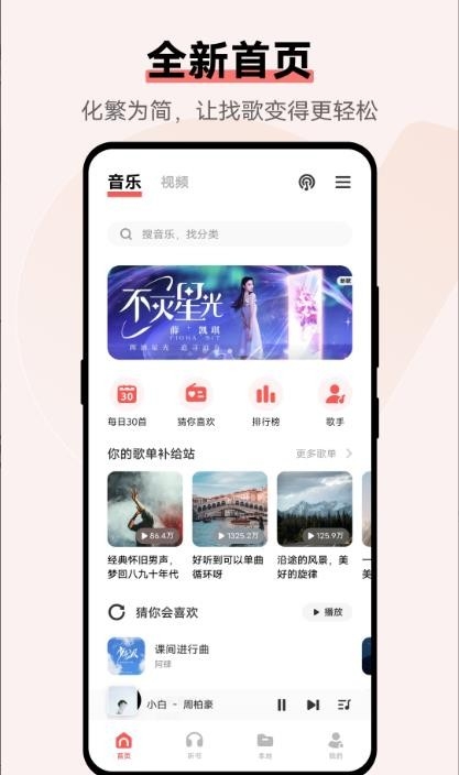 2、全新界面,打造属于你的首页首页入口提供图标自定义,要什么功能由你决定;推荐内容根据您的喜好,推荐更符合你口味的歌曲