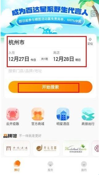 2、接下来先定位好城市,再输入入住时间和离店时间后,点击开始搜索
