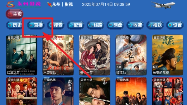1、在电视上打开永州影院app,进入主界面点击“直播”。