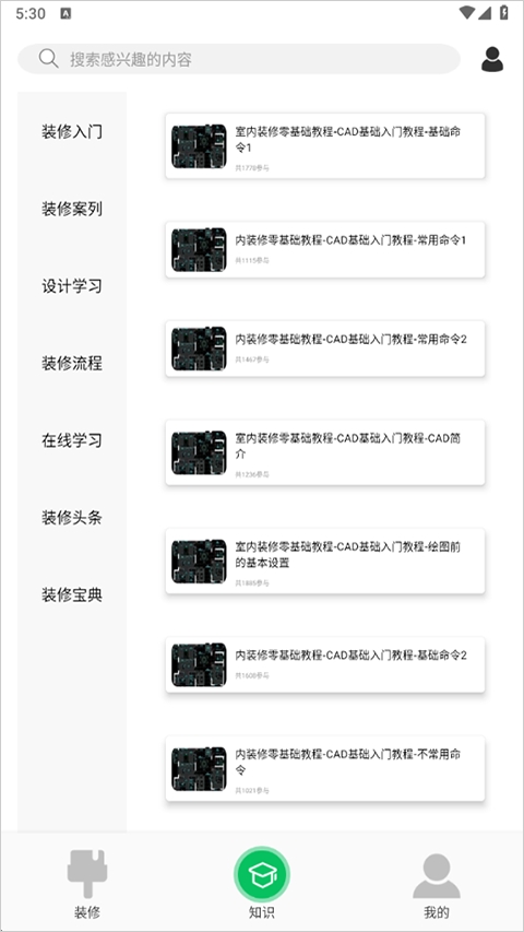 3、打开知识版块,可以学习装修入门知识、装修流程等;