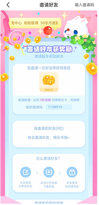 1、打开软件,点击邀请好友可以获取海量乐币,邀请达到数量更有畅玩卡、充值券;
