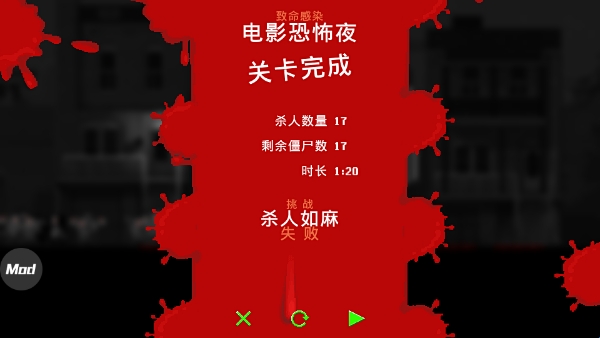 1、该游戏有特别的多的模式,每种模式中还包含特别多的玩法,下面进入第一个知名感染模式,选择电影恐怖夜,这个关卡目标是感染3个人类,然后杀死14个人即可挑战成功,接下来点击绿色的播放键开始游戏吧。