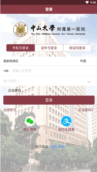 用户注册成功后,请输入“登录名(手机号码)“和”密码“登录进入中山大学附属第一医院app软件。如下图: