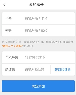 4、输入福卡卡号及密码等相关信息,点击确定添加即可。