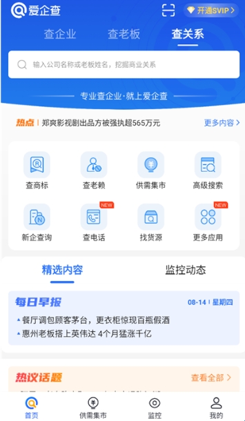 爱企查,由北京百度网讯科技有限公司官方推出打造的一款查询企业信息的软件。软件能够轻松快速帮助用户查询各种企业的工商登记信息、年报、咕咚信息,投资人信息、法人等,满足用户查询企业信息的各种需求。你还能使用软件查老赖、查商标等,多种实用功能等你来使用。