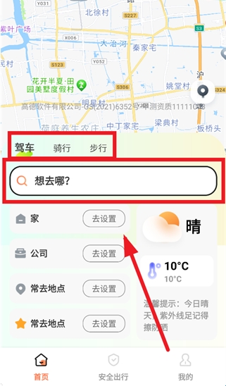 1、打开实时掌上导航app,进入后在首页选择出行方式,点击搜索框搜索目的地;