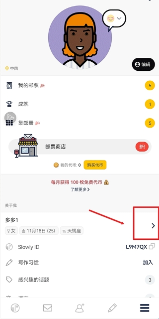 1、在app内点击底部最右边的图标打开个人中心。然后点击名字右边的箭头