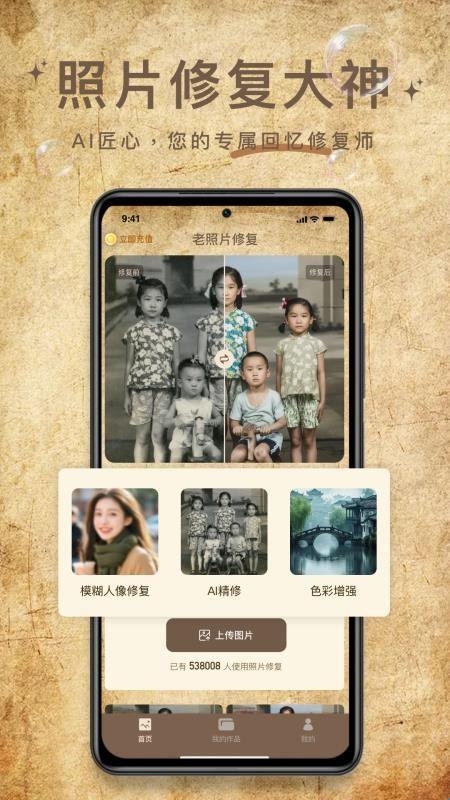 照片修复大神app是一款非常好用的照片美化修复类工具软件,这款软件不仅可以将各种模糊破损的照片变得清晰美观,还可以对黑白照片进行智能上色,让用户可以看见照片最本真的状态。不仅如此,软件还设置了时光作品集功能,用户可以将修复好的照片编辑上传保存,方便日后寻找查看,喜欢的朋友们千万不要错过哦。
