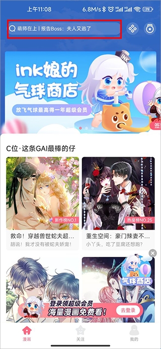 1、打开之后,在主页界面,可以点击顶部的搜索框,搜索想看的漫画。