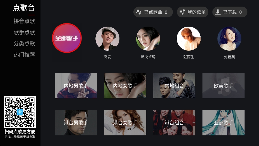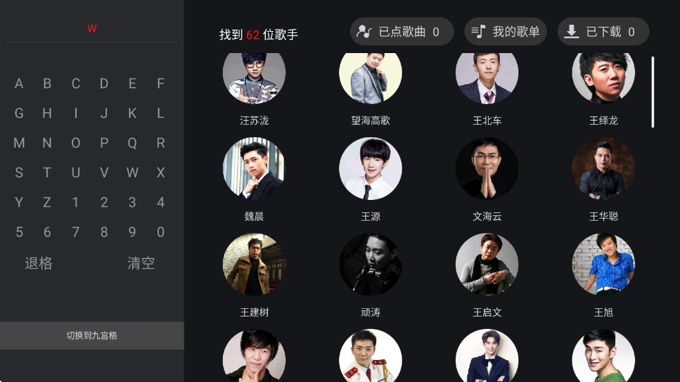2、在选取自己喜爱的歌曲时,用户可以根据演唱者的角度从歌手方面搜索歌曲,如果觉得麻烦还可以使用拼音首字母的形式搜索歌曲