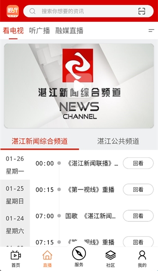 直播可实时收看湛江新闻综合频道、公共频道,还能回看节目。
