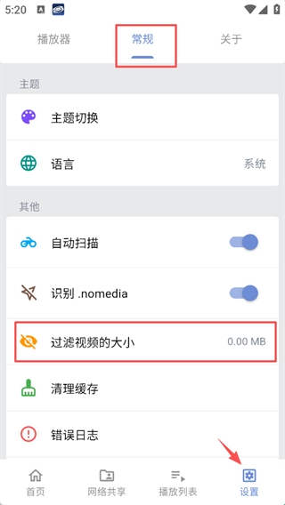 2、如果我们手机里的视频资源比较多,而你又只想追剧,那可以在设置-常规-其他栏里过滤掉并自定义视频的大小,比如大部分片子都在100M以上,我们设置100M,软件就会过滤掉100M以下的视频资源,非常的方便。