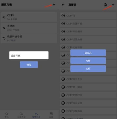 4、另外还提供了网络在线播放功能,只需要在播放列表页面,点击右上角+字符号,输入直播名字,再次重复点+,然后输入流媒体的地址就可以了,直接摇身变电视看直播。