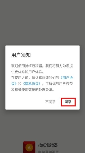 1、在游娱网下载并打开抢红包猎器,阅读弹出的用户须知,点击【同意】;