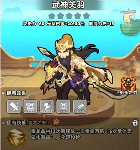 关羽船长的专属技能强化落雷的效果,每释放X次金落雷获得一次加强版的技能释放,且落雷技能获取容易,升级强化容易,在后期中也比较少被克制。