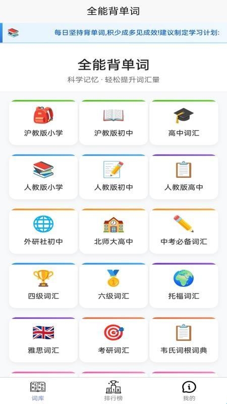 全能背单词app是一款非常好用的英语单词学习记忆类软件,在这款软件中,用户可以学习到多种单词资源,提高自己的英语词汇量,也可以了解每一个单词的具体意思和用法,帮助用户更牢固地记忆单词。不仅如此,软件将各种单词资源按照不同的难度进行分类,用户可以循序渐进地进行学习,有利于提高学习效率。