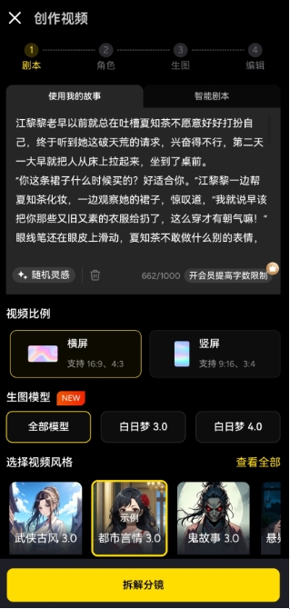 2、首先输入你的故事内容,也能让AI帮你写。然后选择视频比例、生图模型、视频风格,点击【拆解分镜】。