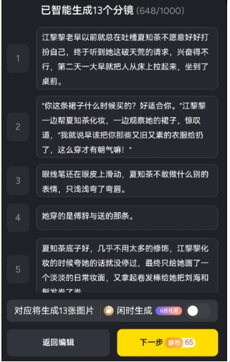 3、AI会帮你生成多个分镜,点击【下一步】,这一步需要花费65个梦币。