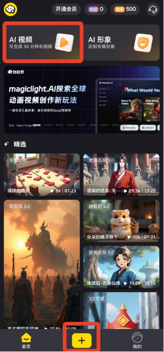 1、点击下方中间的【+】号,或者上面的【AI视频】,开始创作。